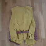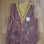 Das Gilet besteht auf der Vorderseite aus Paillettenstoff und auf der Rückseite aus normalem gelbem Stoff und kann mit Druckknöpfen verschlossen werden.